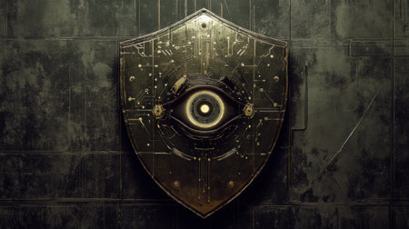 A shield with intricate cybernetic designs and a robotic eye symbolizes artificial intelligences role in enhancing cybersecurity measures.