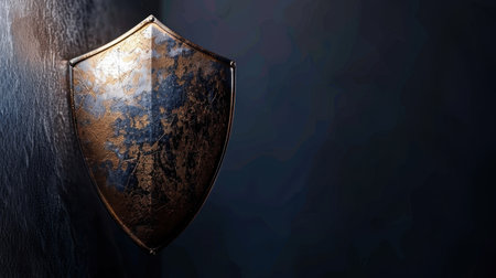 Detailed, vintage shield with weathered surface, showcasing intricate textures and blend of gold and bronze hues. shield is positioned against dark background, evoking sense of history
