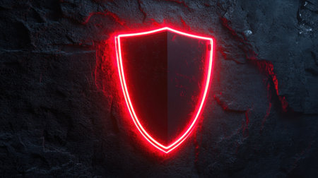 Red neon shield symbol illuminating a dark, textured background, ideal for security or safety themes.