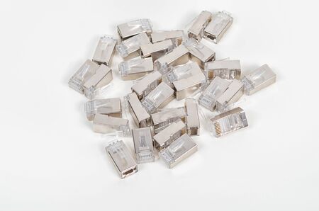 Group of RJ-45 connectors on white background, Connectors are translucent and collored with blue light