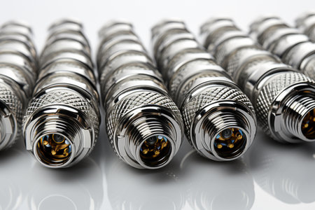 This image showcases a close-up view of multiple ethernet connectors aligned in a row against a clean white background, highlighting the intricate details of the connectors.