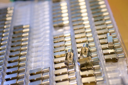 Isolated monochrome close up of closely aligned multiple through hole assembly rj45 ethernet networking hardware connectors in partial focus