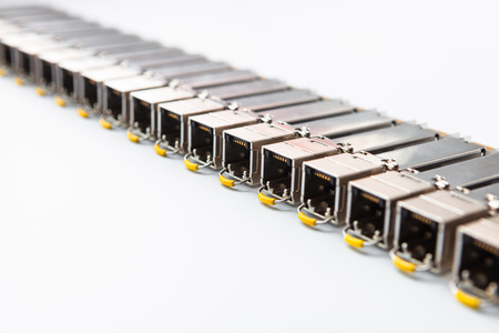 Internet SFP (Small Form-factor Pluggable) network modules for network switch. Concept of internet communication and connection. SFP is used for both telecommunication and data communications applications