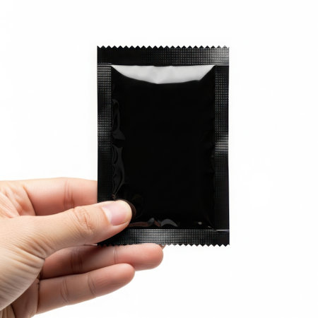 This image features a hand holding a square packet of a condom against a white background. The packet is metallic and reflective, and the hand is positioned to clearly display the packet. The image is well-lit and focuses on the packet, making it the central element. The white background ensures that the packet stands out prominently.