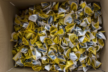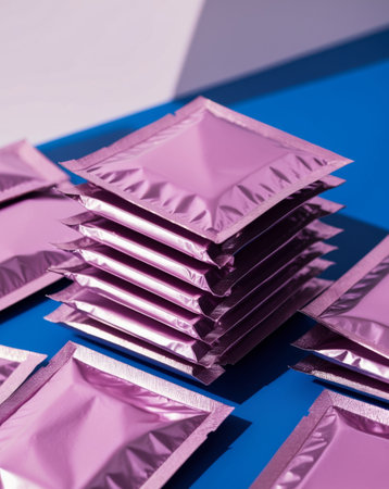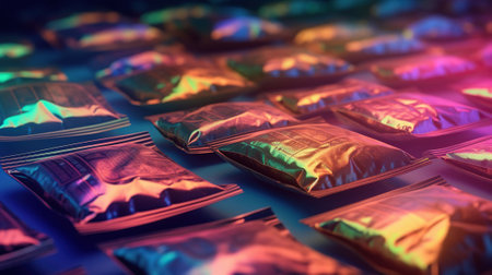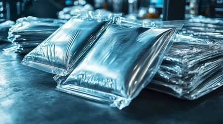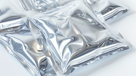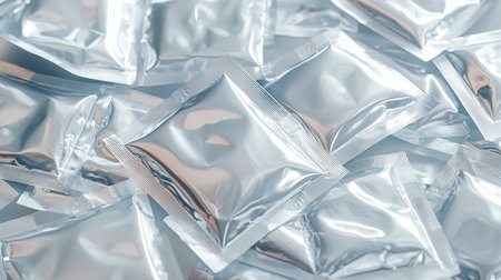 Shiny Silver Foil Packets Arranged in a Pile for Versatile Packaging Concept