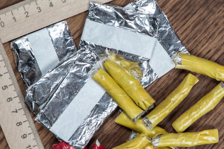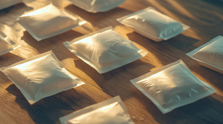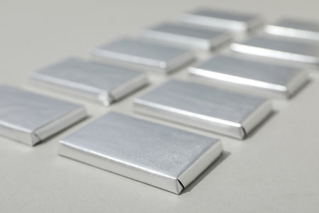 Shiny Silver Foil Packets on Wooden Surface with Blurred Background