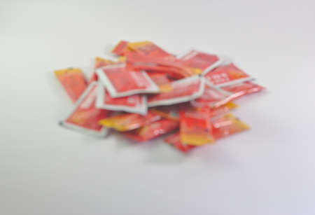 Many tomato sauce sachets from convenience stores.Blurred image White background