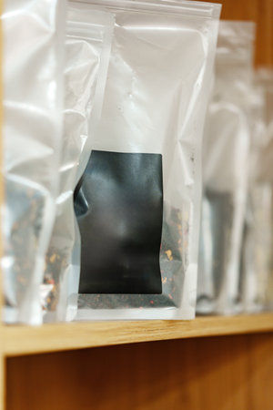 Sealed packages of loose tea displayed on a wooden shelf in a cozy shop