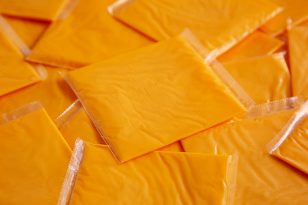 American Cheese Slices in Wrappers, side view.