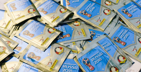 BERLIN, GERMANY - APRIL 28, 2018: Many packs of official FIFA licensed Panini collectibles sticker and album for the football world cup 2018 in Russia.