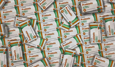 Probiotic pack production. Medical antibiotic therapy drug box factory. Abstract concept 3d rendering illustration. Live bacteria cultures for healthy microbiome flora and gut microbiota.