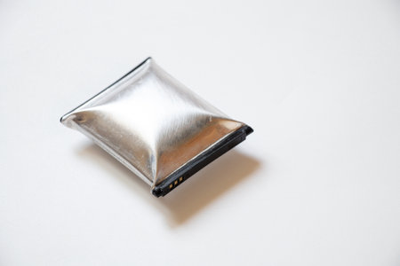 A telephone battery that is swollen from overheating lies on a white background, the phone battery is inflated