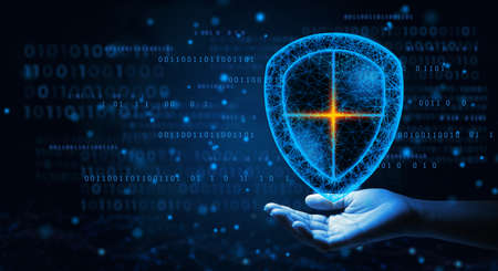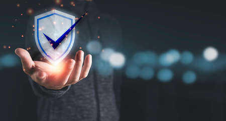 Internet Privacy, Technology And Data Protection Concept. Closeup of businessman holding virtual security shield hologram. Safe your personal information from fraud and online crime.