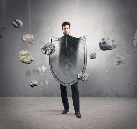 Businessman with shields. concept of protection and defense in the business world