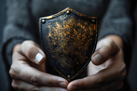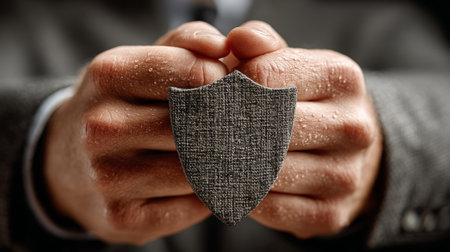A close up of hands gripping a shield made of textured fabric, signaling protection and security.