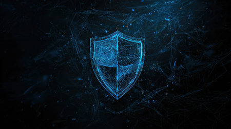 This visually striking representation showcases an abstract shield made of glowing particles in blue and gold hues, symbolizing digital protection and security.