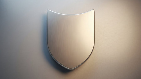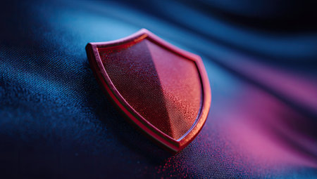 A close-up view presents a metallic shield, resting on a textured fabric backdrop. The shield, with a glossy finish, reflects light. The composition features a gradient of colors. This image could be suitable for various commercial purposes and conceptual designs related to security.