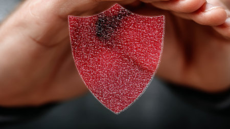 Close-up of hands enclosing a red shield representing protection and security concepts