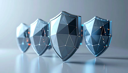 A row of gleaming, polygonal shields stands as a formidable digital fortress. Each shield, interconnected by a glowing network, represents a layer of advanced cybersecurity, offering robust protection and ensuring data integrity against all virtual threats. This is the frontline of modern digital defense.