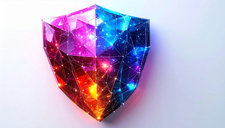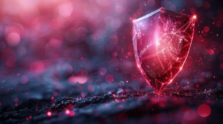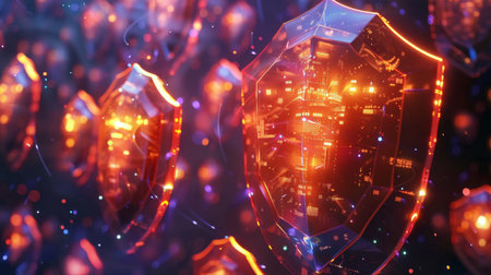 A luminous crystalline shield glows with the interconnected data points of a secure network. This digital fortress represents the pinnacle of cybersecurity, offering robust defense against virtual threats and symbolizing innovation in data protection.