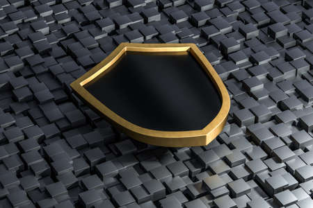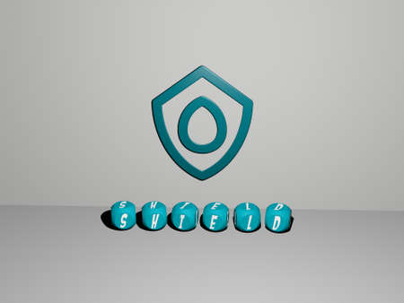 3D graphical image of shield vertically along with text built by metallic cubic letters from the top perspective, excellent for the concept presentation and slideshows. illustration and icon