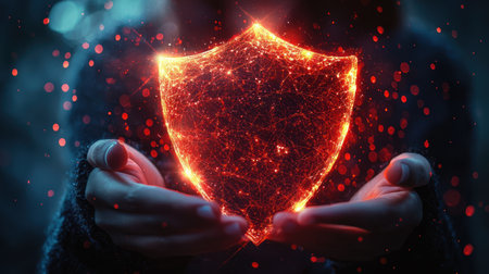 A Risk management shield protection concept glowing in hands, symbolizing safety and security