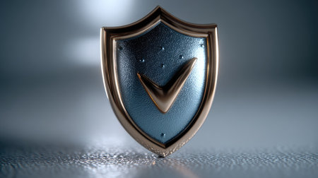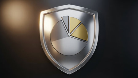 The image features a metallic shield with a pie chart in its center. The shield is designed with a modern aesthetic, having a smooth, reflective surface. The pie chart within the shield displays three segments in different shades of gray and gold, indicating a data distribution. The background is dark, which highlights the shield and the pie chart, giving it a prominent and professional appearance.