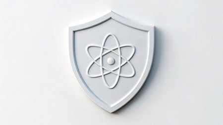 3d render of a shield with atom symbol on a white background