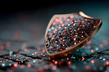 A digital shield surrounded by glowing red and blue particles symbolizes advanced cybersecurity technologies. the focus on intricate circuit patterns highlights digital protection mechanisms in a modern virtual environment. Generative AI