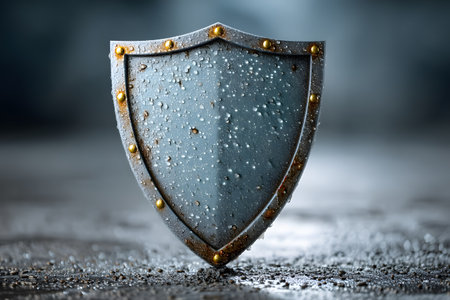 A close-up of a medieval shield adorned with water droplets, set against a blurred background. the metallic texture and rivets emphasize themes of durability, protection, and historical warfare. Generative AI