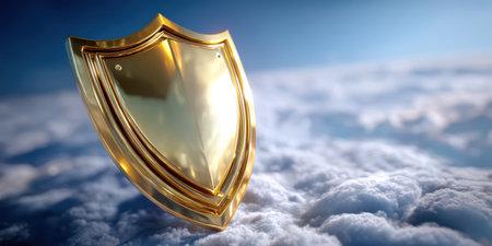 Golden shield floating above soft clouds with bright sky background, symbolizing protection and strength in serene atmosphere