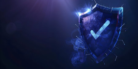 A dark blue polygonal wireframe shield with a check mark symbolizing secure cybersecurity protection. Concept Cybersecurity, Shield, Protection, Wireframe, Checkmark