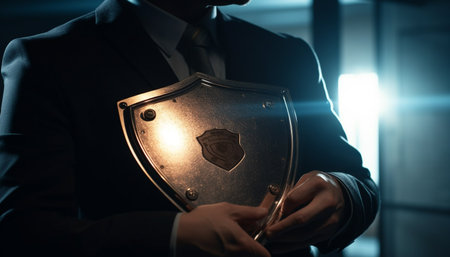 Upscale Business Person Holds Golden Shield In Symbol Of Protection, Security, And Stability