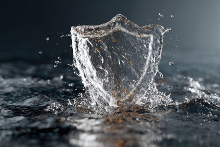 This image showcases a bright shield made of water, splashing dynamically to symbolize protection against data streams, combining creativity and technology in a striking visual.
