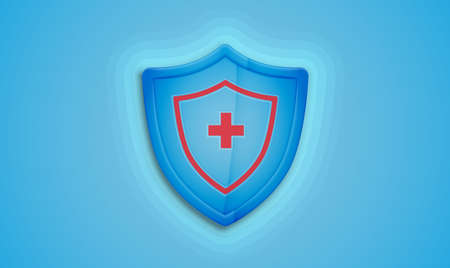 Realistic shield with medical sign on a blue background, vector illustration