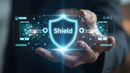 Hand holding a glowing digital shield with network lines connecting two phones. Clear details and...