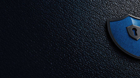 A close-up view presents a blue shield icon with a keyhole emblem, positioned against a textured, dark background. The lighting highlights the metallic sheen of the emblem. The composition and color palette suggest themes of security and data protection, suitable for various visual communication projects.