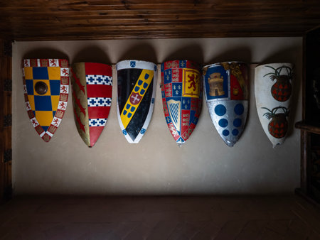 Russia, Sochi 14.03.2020. A knights shield depicting a cross and lions hangs on the wall. Closeup photos