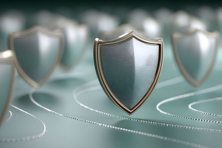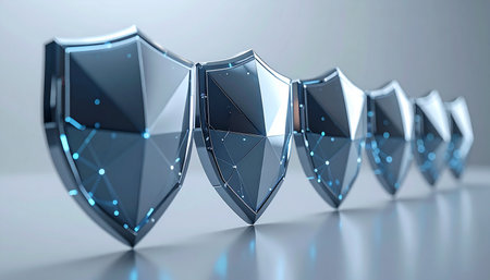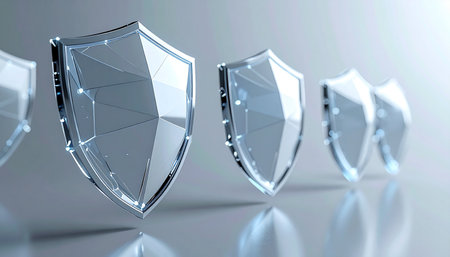 A row of pristine, transparent glass shields stands as a formidable barrier, symbolizing layers of advanced digital protection. This futuristic concept represents the strength and clarity of modern cybersecurity systems safeguarding sensitive data from unseen threats.