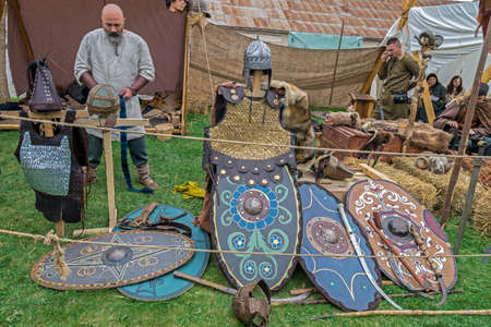 Dacian soldiers in battle costume, shows ancient manufacturing weapons at APULUM ROMAN FESTIVAL, organized by the City Hall Alba Iulia, Romania.