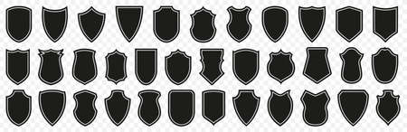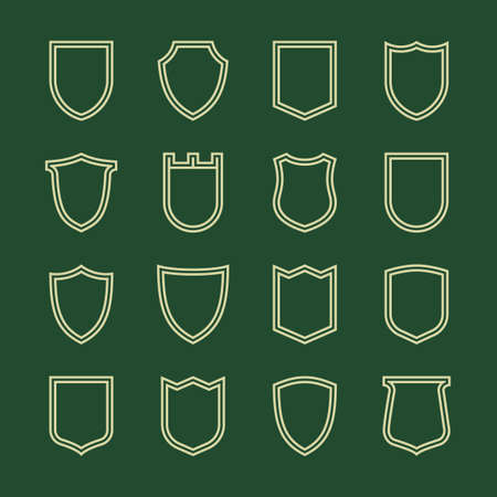 Icons of gold shield moderns, gold medieval knight ammo, guards with engraved borders, award trophies, military armor front view isolated on black background with reflections, realistic 3D clipart..