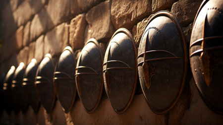 Hoplite formation shields creating unbreakable wall sun casting dramatic shadows