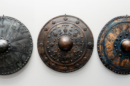 Discover intricate Viking shields and helmets illuminated warmly, revealing ancient artistry in Norway.