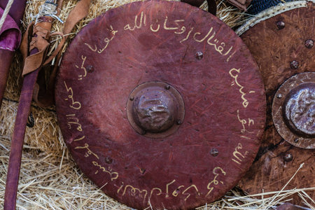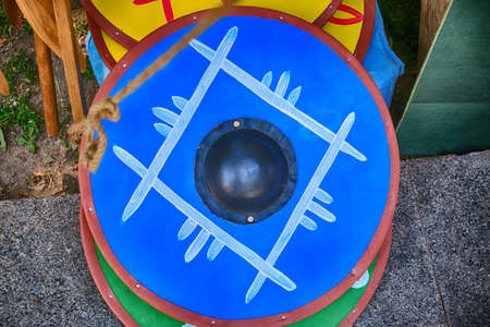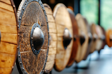 Weathered viking shield with intricate wood grain and battle scars, showcasing texture and history