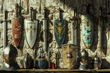 A collection of medieval armor and weapons are displayed on a wall. Scene is one of historical significance and the idea is to showcase the craftsmanship and design of these ancient weapons