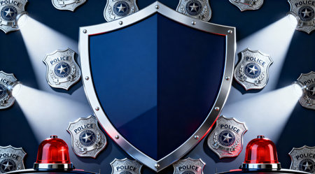 This illustration showcases a bold and authoritative style with dramatic lighting, ideal for conveying strength and security. It's perfect for law enforcement branding, safety awareness campaigns, or editorial content in police-related publications. The modern design adds a contemporary touch to traditional symbols. AI-generated illustration.
