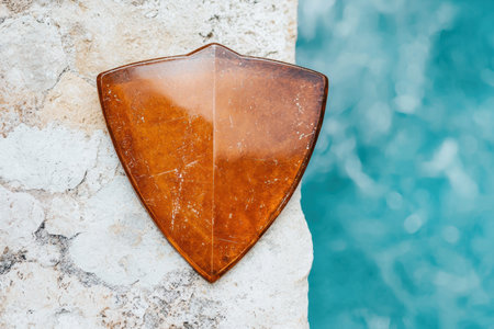 A metallic shield with water droplets sits against a blurred background, symbolizing strength, protection, and resilience. the droplets add texture and depth, enhancing the theme of steadfast security. Generative AI