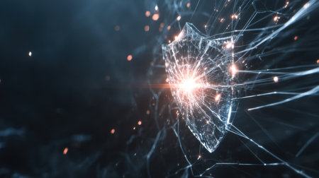 Digital representation of shattered shield, symbolizing protection and security. image features intricate lines and glowing particles, creating dynamic and futuristic atmosphere