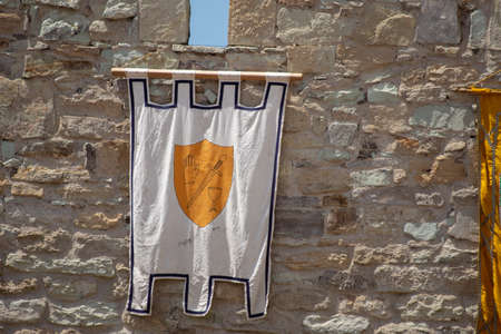 Medieval battle flags on the wall of the Citadel of Bistrita, Romania, 2022, June