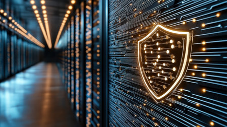 A digital shield protecting a network of servers and computers, symbolizing cybersecurity and secure data transmission.